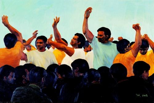 ‘무제’(1996) 속 인물들의 뭉개진 얼굴은 몰살된 개인의 개성을 은유한다. 작품에 등장하는 모든 인물은 이렇듯 무명인으로 묘사되어 있으나 화면 구성에 있어 두 집단은 사뭇 다른 분위기를 띈다. 상단 면에 존재하는 인물들은 밝은 색채로 표현되어 있으며 하늘을 쳐다보며 팔을 들어 올리는 역동적인 상승의 제스처를 보이는 반면, 어두운 색채로 이루어진 화면 아래의 군중들은 엉거주춤한 자세로 고개를 숙이고 있다. 이들의 몸은 마치 하나의 덩어리처럼 투박하게 묘사되어 있는데, 이는 개인의 개성은 지워진 채 사회를 지탱하는 구성원이라는 최소한의 정체성으로 살아가는 현대인의 현실을 적나라하게 드러낸다. 익명의 존재들로 구성된 두 군중의 오묘한 충돌은 화면에서 드러나는 구도와 상반된 색채를 통해 공존이 아닌 단절의 시대를 살아가는 현대 사회를 표현하고 있다. 김경미 부산시립미술관 학예연구사