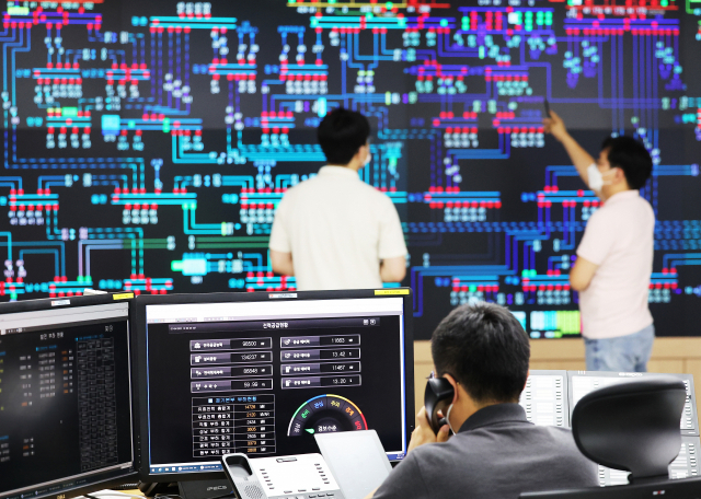 전국 대부분 지역에 폭염특보가 발령된 지난 4일 전력 사용량이 급증하자 한국전력공사 경기지역본부 전력관리처 계통운영센터에서 관계자들이 전력 수급 상황을 점검하고 있다. 연합뉴스