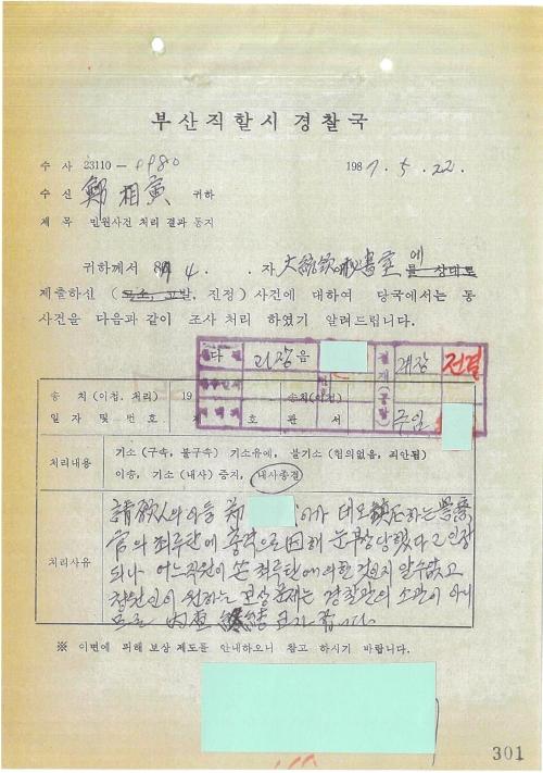 진실화해위에 따르면, 사건 이후 1987년 5월 22일 경찰이 작성한 ‘최루탄 피해 민원 사건 처리를 위한 기안문’과 ‘민원 사건 처리 결과 통지문’ 등 자료상에는 정 씨가 최루탄으로 부상당한 것은 인정하나 보상 문제는 경찰관 소관이 아니어서 내사종결한다는 내용이 담겨 있다. 진실화해위는 “당시 부산경찰국의 내사 사건 수사기록과 피해자와 관련인 진술 등을 통해 정 씨의 부상이 경찰 최루탄에 의한 것임을 확인했다”며 “경찰이 국민의 생명과 재산을 보호해야 하는 의무를 소홀히 한 것”이라고 판단했다.