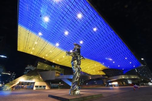 지난 3월 부산 해운대구 영화의전당에서 우크라이나를 돕자는 취지로 진행된 ‘평화의 빛’ 캠페인. 부산시 제공러시아와 전쟁 중인 우크라이나 의회 대표단이 8일 부산을 찾아 의료 지원, 전후 재건 문제 등을 논의한다.