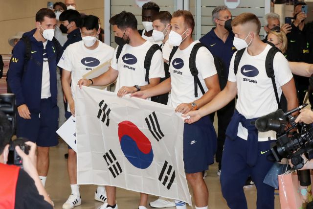 잉글랜드 프로축구 프리미어리그(EPL) 토트넘 선수단이 10일 프리시즌 투어를 위해 인천국제공항으로 입국, 마중 나온 손흥민(왼쪽 두 번째)과 함께 태극기를 들고 기념촬영하고 있다. 오른쪽에서 두 번째가 손흥민의 ‘단짝’ 해리 케인이다. 토트넘은 13일 팀 K리그, 16일 세비야(스페인)와 두 차례 친선경기를 치른다. 연합뉴스