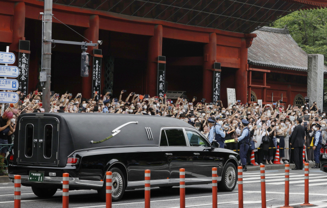12일 오후 일본 도쿄 내 사찰 '조조지'에서 아베 신조 전 총리 장례식이 끝난 뒤 운구차가 나가는 모습. 많은 시민이 몰려 나와 아베 전 총리를 추모하고 있다. 연합뉴스