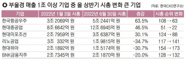 부울경 기업 가운데 6개월새 시총이 가장 많이 오른 곳은 한국항공우주(KAI)로 1월 초 3조 2069억 원에서 6월 말 5조 2441억 원으로 63.5%(2조 372억 원) 증가했고, 현대중공업도 8조 6643억 원에서 12조 6945억 원으로 46.5%(4조 302억 원) 늘어났다. 시총순위에서도 한국항공우주는 108위에서 63위로 45계단 올라갔고, 현대중공업도 51위에서 22위로 29계단 상승했다. 현대중공업은 두산에너빌리티(옛 두산중공업)을 제치고 부울경 시총 1위 기업에 등극했다.