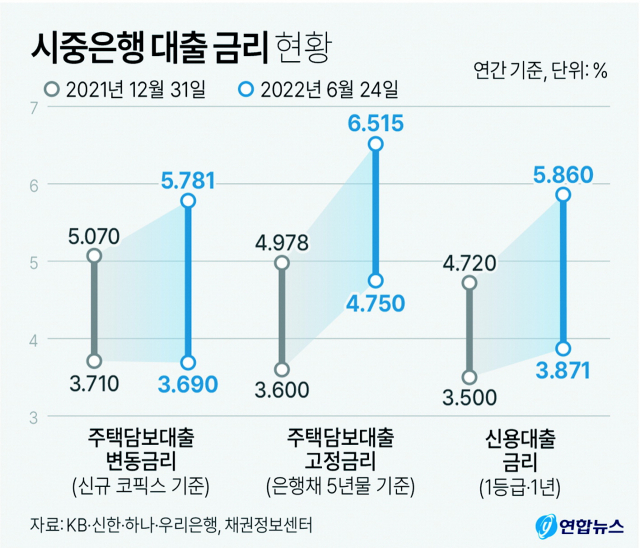 연말까지 추가 기준금리 인상이 이뤄지면 6%대 중반을 넘어선 대출금리 상단도 올해 말께 7%대를 넘어 8%에 근접할 가능성이 높다. 이 경우 금융소비자 입장에서는 ‘글로벌 금융위기’에 버금가는 금리 수준을 경험하게 된다.