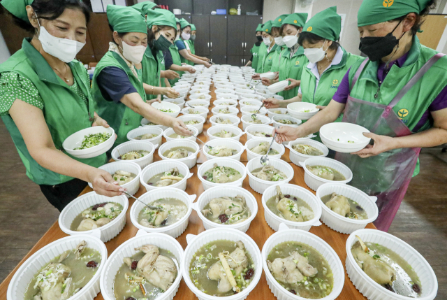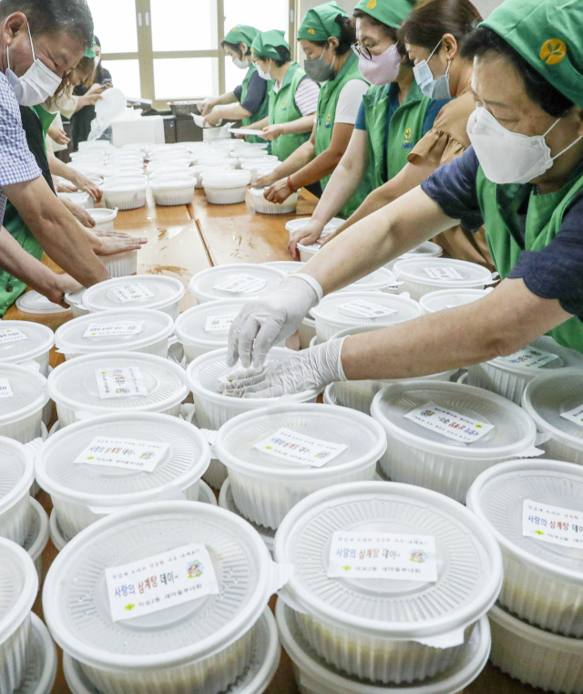 초복을 이틀 앞둔 14일 오전 부산 사상구 덕포2동 행정복지센터에서 새마을부녀회 회원들이 사랑의 삼계탕데이를 열고 홀몸노인 등 지역 소외계층에 전달할 삼계탕 100인분을 만들어 용기에 담고 있다.