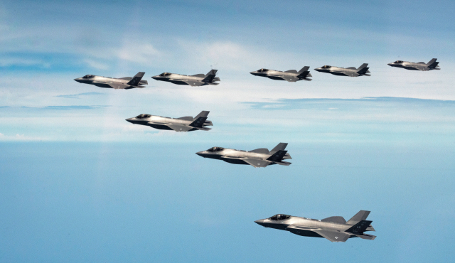 한·미 공군이 지난 11~14일 연합 작전 수행능력을 향상시키기 위해 F-35A 연합비행훈련을 최초로 실시했다고 밝혔다. 미국 편대장이 편대를 이끄는 장면. 공군 제공