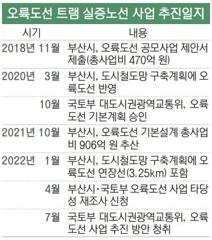 기본설계 과정에서 기존 470억 원의 사업비가 배 가까이 증가해 모두 906억 원이 필요해진 오륙도선 트램 실증노선은 불어난 예산 규모로 사업 자체가 흔들리는 모습이다. 부산시는 3월부터 국토교통부와 사업비 증액분 약 436억 원을 국비와 시비 6 대 4로 분담하는 방향으로 기획재정부를 설득해 왔다. 기재부는 당초 연구개발 사업을 도시철도 사업으로 변경해 예산을 지원할 근거가 없다는 이유로 '지원 불가' 입장을 드러낸다.