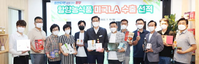 경남 함양군은 18일 산양삼을 비롯해 여주 가공품, 죽염, 부각 등 35여 품목(52만 불 상당)의 함양농식품을 선적하고 미국 LA 수출길에 올랐다.