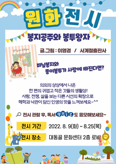 부산 남구 대동골문화센터 작은도서관은 여름방학을 맞이하여 문화센터 이용자 및 작은도서관을 이용하는 어린이들을 대상으로 8월 9일(화) ~ 25일(목)까지 남구 대동골문화센터 2층 로비에서 그림책 작가 이영경의 '봉지공주와 봉투왕자' 원화 액자(15점)를 전시한다.