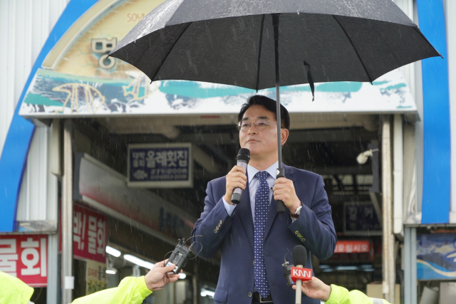 더불어민주당 박용진 의원이 18일 부산 강서구 명지시장 공터에서 당대표 선거 출마를 공식 선언했다. 명지시장은 2000년 16대 총선에 출마한 고 노무현 대통령의 청중 없는 연설로 화제가 됐던 곳이다. 박용진 의원실 제공