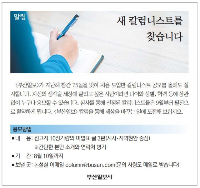 〈부산일보〉가 지난해 창간 75돌을 맞아 처음 도입한 칼럼니스트 공모를 올해도 실시합니다. 자신의 생각을 세상에 알리고 싶은 사람이라면 나이와 성별, 학력 등에 상관없이 누구나 응모할 수 있습니다. 심사를 통해 선정된 칼럼니스트들은 9월부터 필진으로 활약하게 됩니다. 〈부산일보〉 칼럼을 통해 세상을 바꾸는 일에 도전해 보십시오.