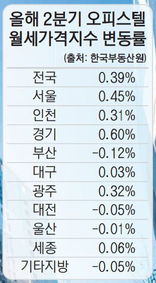 수도권과 지방의 매매·전세가격 차이도 벌어졌다. 서울의 매매가격은 1분기보다 0.41% 상승했고, 경기도도 0.18% 올랐다. 반면 부산(-0.47%), 대구(-0.48%), 대전(-0.34%) 등 지방 대부분이 하락해 지방 전체 오피스텔의 매매가는 1분기보다 0.41% 내려간 것으로 나타났다.