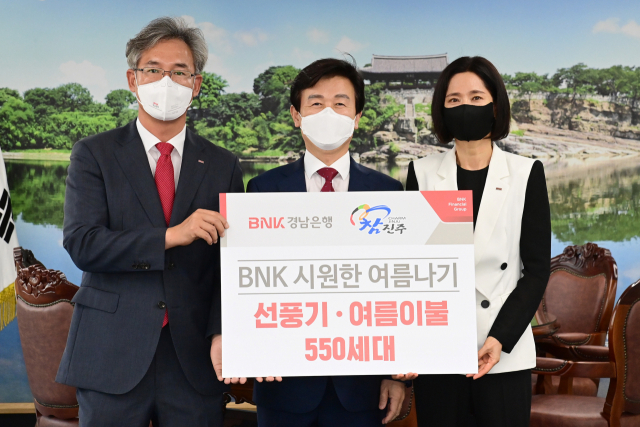 BNK경남은행이 19일 경남 진주시를 찾아 저소득 소외계층 550가구에 선풍기 275대와 여름이불 275채 등 여름 나기 성품을 기탁했다.