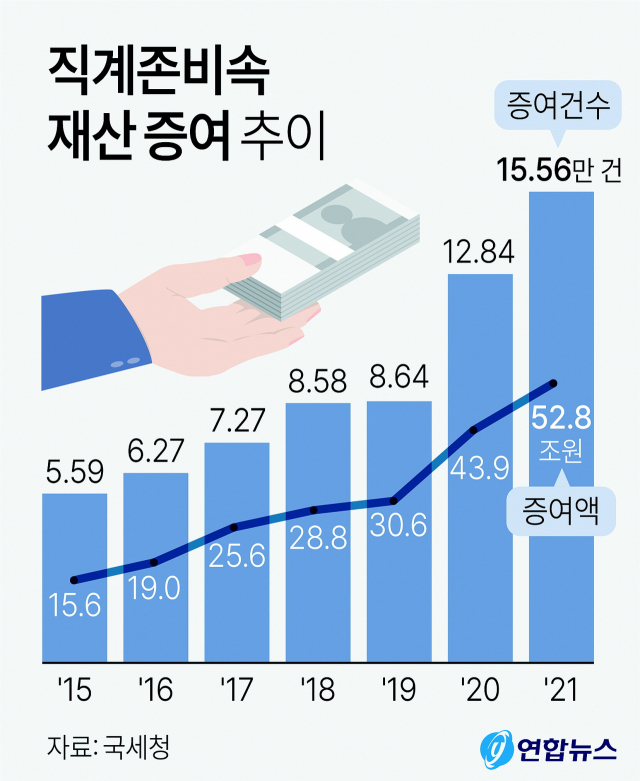 직계존비속 간 증여건수는 2010∼2013년 4만 건 대에서 2018년 8만 건 대, 2020년 12만 건 대로 증가했고 2021년에는 15만 건을 돌파했다.