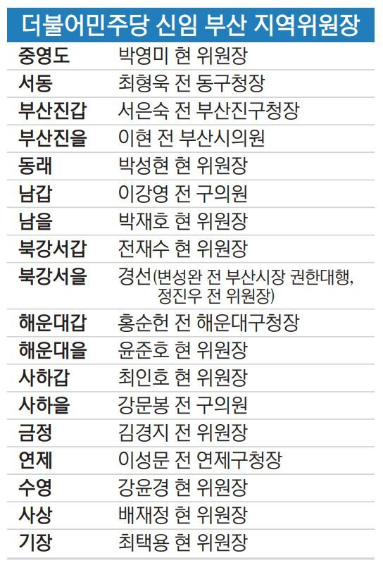 동구에서 오랫동안 시의원, 기초단체장으로 활동한 최형욱 전 동구청장도 서동 지역위원장에 선임되며 차기 총선 공천에 성큼 다가섰다. 다만 서구 표심을 얼마나 공략할지가 숙제다. 법조인 출신으로 원만하게 구정을 이끌었던 40대의 이성문 전 연제구청장도 총선에 도전한다. 위원장직을 내려놓은 김해영 전 의원의 향후 행보가 변수가 될 전망이다. 부산진을 3인 경선에서 이변을 일으키며 이번 부산 지역위원장 중에 최연소로 당선된 이현(35) 전 시의원은 30대 젊은 패기로 부산 민주당 첫 여성 지역구 국회의원에 도전장을 던졌다. 유임된 지역위원장 중에선 현역 3인방 외에 윤준호(해운대을) 전 의원의 공천이 유력하다.