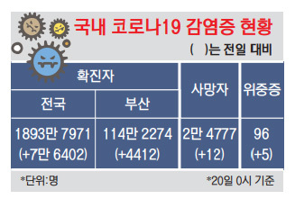 부산시는 20일 0시 기준 코로나19 신규 확진자 4412명이 발생했다고 밝혔다. 일주일 전인 지난 12일 2503명의 1.8배 수준으로, 부산의 하루 확진자는 전날 4890명에 이어 이틀 연속 4000명을 넘어섰다. 이 추세가 이어지면 다음 주 하루 확진자는 9000명 안팎이 될 것으로 보인다. 경남과 울산에선 각각 3846명과 2106명의 신규 확진자가 나왔다. 국내 총 신규 확진자는 7만 6402명이며, 위중증 환자는 전날보다 5명이 늘어난 96명으로 집계됐다.