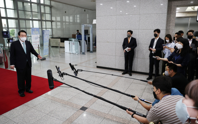 윤석열 대통령이 21일 오전 서울 용산 대통령실 청사로 출근해 기자들의 질문에 답하고 있다. 연합뉴스