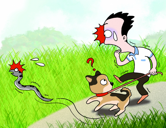 먼저 한 일은 강아지의 (목)줄을 잡아당기는 일이었다. 강아지가 뱀을 먼저 발견했다면, 틀림없이 다가가서 냄새부터 맡으려 했을 것이기 때문이다. 단단히 줄을 움켜쥐고 나서야, 길을 가로지르는 뱀을 똑바로 쳐다볼 수 있었다. 그 역시 급해 보였다.