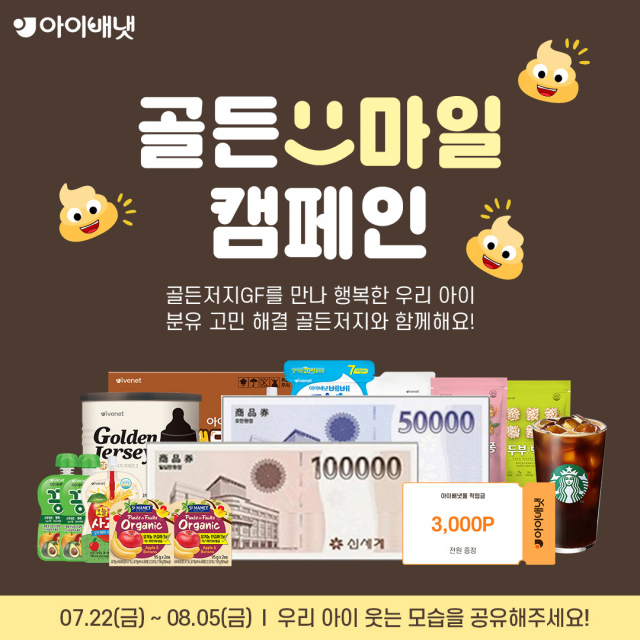 △영유아 식품 전문기업 아이배냇이 오는 8월 5일까지 '골든스마일 캠페인'을 진행한다. 아기의 첫 먹거리인 분유의 기본이자 본질인 원유 품종에 집중해 만든 골든저지GF와 함께 엄마들의 분유고민 해결에 도움을 주고자 마련됐다. 골든저지GF는 원유의 본질인 소의 품종부터 차별화를 둔 국내 유일의 저지 분유 제품이다. 모유, 산양유에 존재하는 A2 β-카제인의 함량이 높아 아이의 소화 흡수가 보다 용이하다. 캠페인 기간 동안 아이배냇은 다양한 콘텐츠를 통해 아이의 첫 먹거리와 성장의 중요성에 대한 정보 제공, 인식 개선 등에 나선다. 소비자는 다양한 참여형 활동과 체험단 등에 참여할 수 있다. 인스타그램에서는 '골든육아챌린지'에 참여할 수 있다. 육아대디와 육아맘 누구나, 아이배냇 AR필터를 활용해 활짝 웃는 아이의 일상이 담긴 영상을 찍어 필수태그와 함께 본인 인스타그램 피드에 업로드하면 된다. 추첨을 통해 당첨되면 신세계상품권(10만 원, 1명), 3만 원 상당의 아이배냇 간식 박스와 골든저지 3단계 800g 1캔(10명), 스타벅스 아메리카노 쿠폰(30명)을 받을 수 있다. 아이배냇몰에서는 골든저지 정품체험단과 사행시 이벤트에 참여할 수 있다. 체험단은 육아대디와 육아맘 누구나 이벤트 페이지를 통해 네이버폼에 접속해 신청하면 된다. 골든저지를 키워드로 진행하는 사행시 이벤트는 아이배냇몰 이벤트 페이지에 댓글을 남기면 된다. 각 당첨자 발표는 8월 10일 아이배냇몰 홈페이지에서 이뤄진다.