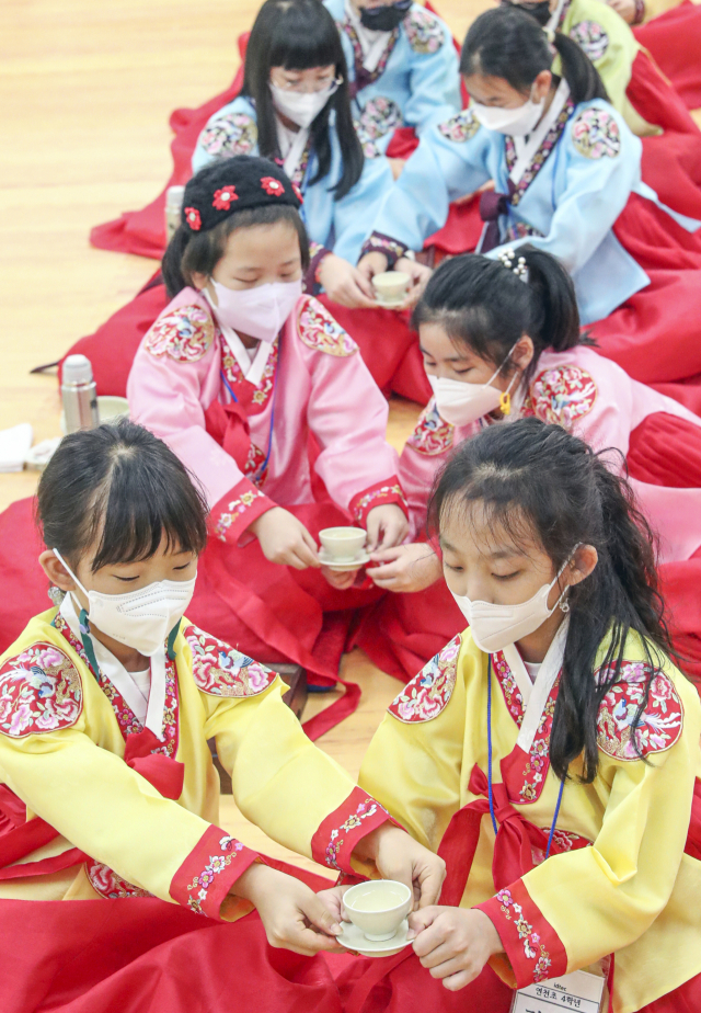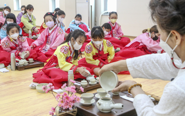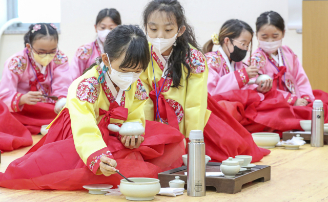 여름방학을 맞아 초등학생 전통문화 체험교실이 열린 25일 부산 동래구 충렬사 안락서원 교육회관에서 초등학생들이 한복을 곱게 차려입고 다도 예절을 배우고 있다. 이번 체험교실은 29일까지 전통서당체험, 미풍양속 및 민요 배우기, 성역지 탐방, 민속놀이 등이 진행된다.