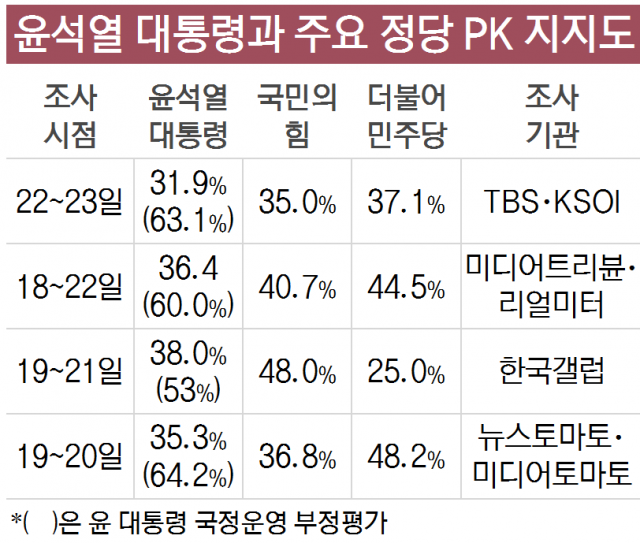 리얼미터와 미디어트리뷴이 지난 4~8일 실시한 여론조사(이하 중앙선거여론조사심의위 참조)에서 윤 대통령의 PK 국정지지도는 40.9%로 추락했고 부정평가는 52.6%로 크게 늘었다. 이 조사기관의 18~22일 조사에선 윤 대통령의 PK 긍정평가가 36.4%로 급락했고, 부정평가는 60.0%로 급증했다. 이 조사에서 윤 대통령이 국정수행을 “매우 잘한다”는 PK 답변은 17.3%에 불과했고, “매우 잘못한다”는 응답은 51.8%였다.