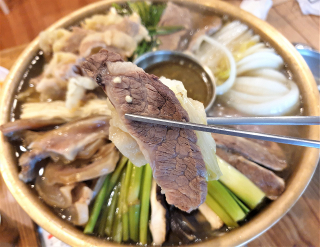 육수에 끓인 소고기는 상당히 부드럽고 고소하다. 육수는 깔끔하고 담백하다. 소고기와 채소는 간장, 청양고추로 만든 양념에 찍어 먹는다.