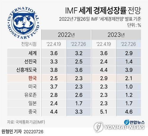 IMF는 올해 한국 성장률 전망치를 종전(지난 4월) 2.5%에서 2.3%로 낮췄다.