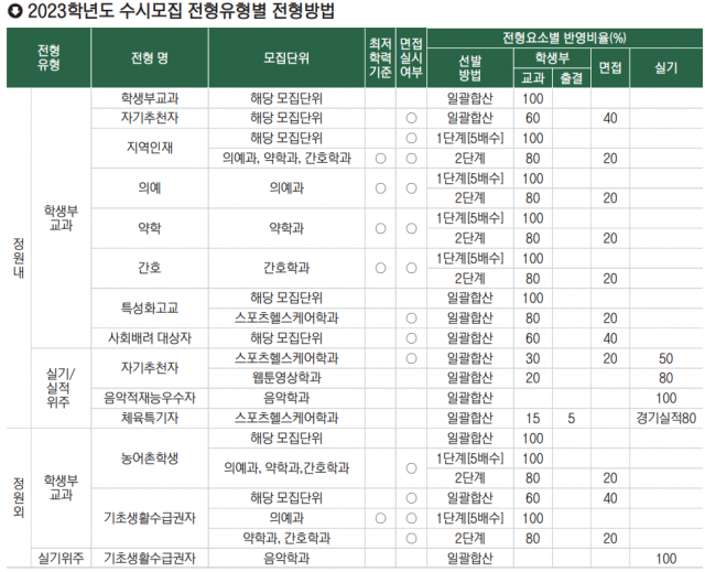 학교생활기록부는 1학년 1학기부터 3학년 1학기까지 성적을 반영하며 의예과·약학과를 제외한 모든 학과는 영어교과 2과목, 국어 또는 수학교과 3과목, 자율교과 4과목(진로선택과목 1과목 포함)을 반영한다. 의예과와 약학과는 과학교과 이수단위 20단위 이상 이수한 자만 지원할 수 있다. 의예과(지역인재전형 제외)는 국어·수학 모든 교과목과 과학교과 2과목을 이수 단위를 고려해 반영한다. 약학과는 국어·수학·영어 모든 교과목과 과학교과 2과목을 이수 단위를 고려해 반영한다.