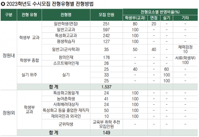 학생부종합전형으로는 창의인재전형과 소프트웨어인재전형이 있다. 서류(학생부)평가 100%로 선발하며, 모집단위별 특성을 고려해 학교생활기록부 교과성적, 학업역량, 전공(계열)적합성, 인성·발전가능성 등을 종합적으로 평가한다. 자기소개서나 교사추천서는 별도로 작성하지 않는다.