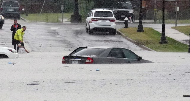 26일(현지시간) 100여 년 만의 기록적 폭우가 쏟아진 미국 미주리주 세인트루이스 한 거리에서 행인이 물에 빠진 주민을 구조하고 있다. 미국 기상청에 따르면 이 일대에는 이날 0시부터 최대 300mm가 넘는 비가 내려 곳곳이 ‘물바다’가 됐다. UPI연합뉴스
