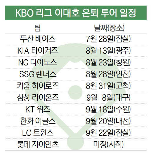 KBO는 28일 두산 전을 시작으로 △KIA 타이거즈 8월 13일(광주) △NC 다이노스 8월 23일(창원) △SSG 랜더스 8월 28일(인천) △키움 히어로즈 8월 31일(고척) △삼성 라이온즈 9월 8일(대구) △KT 위즈 9월 18일(수원) △한화 이글스 9월 20일(대전) △LG 트윈스 9월 22일(잠실) 은퇴 투어 일정을 확정했다.