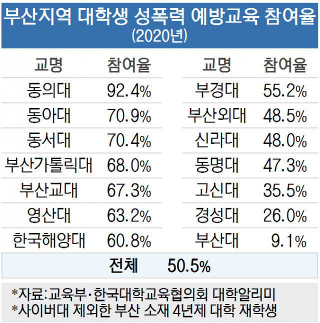 28일 교육부·한국대학교육협의회 대학알리미 통계에 따르면 2020년 기준 부산지역 소재 14개 대학교 재학생 15만 9113명 가운데 대학 주관 성폭력 예방교육에 참여한 비율은 50.5%로 나타났다. 부산지역 대학생 2명 중 1명은 성폭력 예방교육을 듣지 않은 셈이다.