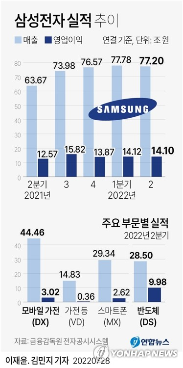 삼성전자는 28일 2분기 연결기준으로 매출 77조 2000억 원, 영업이익 14조 1000억 원을 기록했다고 발표했다.