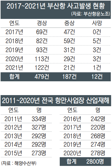 28일 해양수산부에 따르면, 2011년부터 2020년까지 10년 동안 전국의 항만에서 작업하다 사고로 다치거나 죽은 사례는 총 2800건이다. 특히 부산항에서 발생한 사고 빈도는 심각한 수준이다. 부산항운노조에 따르면, 2017년부터 5년 동안 부산항에서 숨진 노동자 수는 12명이다. 이 기간 전국 항만 전체 사망자 수는 19명으로 전체 항만 사망사고의 63%가 부산에서 발생한 셈이다. 전국 항만사고 사망자 세 명 중 두 명이 부산항에서 생길 만큼 부산항은 노동자의 억울한 희생으로 성장한 항만인 셈이다.