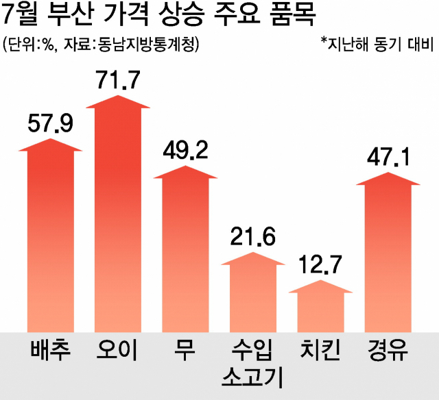 우선 채소류 가격이 급등했다. 부산에서 △배추 57.9% △오이 71.7% △무 49.2% △파 36.9% 등이 올랐다. 전국적으로 상추가 63.1% 상승했다. 물가 상승 흐름 속에 폭염과 잦은 비로 채소 생육이 부진한 것이 원인이다.