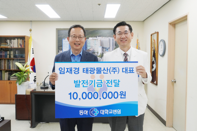 태광물산 임재경(왼쪽) 대표는 최근 동아대병원(병원장 안희배·오른쪽)에 병원발전기금 1000만 원을 기탁했다.