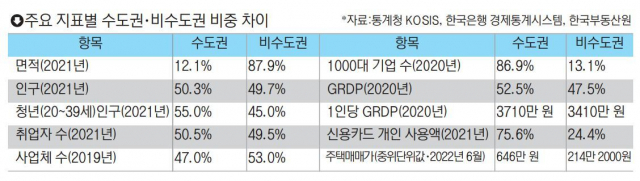 또한 수도권의 1인당 지역내총생산(GRDP)은 3710만 원으로 비수도권(3410만 원)보다 300만 원 많았고, 신용카드 사용액은 수도권이 전체의 75.6%를 차지해 수도권과 비수도권의 생산·소비·자산 수준의 격차가 큰 것으로 조사됐다.