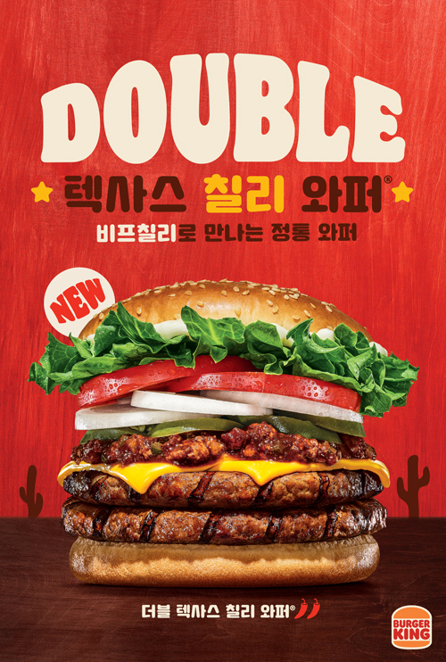 △프리미엄 버거 브랜드 버거킹이 '텍사스칠리'를 더욱 풍성한 맛으로 즐길 수 있는 '더블 텍사스칠리 와퍼'를 출시한다. 6월 출시한 미국 남부 텍사스의 칠리를 가득 담은 텍사스칠리 라인업에 추가되는 신제품이다. 직화로 구운 100% 순 쇠고기 패티 2장이 짭짤한 감칠맛이 돋보이는 비프칠리와 매콤한 할라피뇨를 만나, 더위를 날리는 '맵짠' 매력을 발산한다. 텍사스칠리 라인업은 다진 소고기와 칠리 페퍼를 듬뿍 넣고 끓인 버거킹 특제 비프칠리 소스를 활용했다. '정통 아메리칸 스타일'이라는 콘셉트에 맞춰, 신제품의 등장을 셀러브리티의 내한공연처럼 유쾌하게 담아낸 광고 영상은 공개 4주 만에 유튜브 조회 수 729만 회를 기록할 정도로 뜨거운 관심을 받았다. 버거킹은 성원에 보답하기 위해 7월 초 11번가에서 최대 51% 할인 혜택을 제공하는 라이브 커머스 방송을 진행하기도 했다. 해당 방송은 총 조회 수 119만 회를 기록하며 성황리에 종료됐다. 신제품은 일부 매장을 제외한 전국 버거킹 매장에서 만나볼 수 있다.