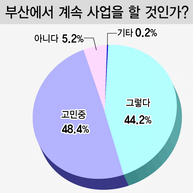 3일 코리아스타트업포럼 동남권협의회(이하 코스포 동남권협의회)에 땨르면 부산 스타트업 대표 95명을 대상으로 부산 창업 환경에 대한 긴급 설문조사를 한 결과, 95명 중 51명이 부산에서 사업을 지속하지 않거나 떠날 고민을 한다고 응답했다. ‘부산에서 계속 사업을 할 것인가’라는 질문에 46명이 ‘고민 중’(48.4%), 5명이 ‘아니다’(5.3%)라고 답했다. ‘그렇다’는 응답은 42명(44.2%)에 그쳤다.
