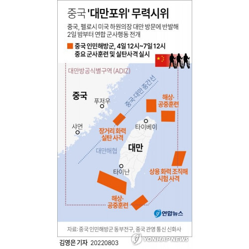 중국은 한국시간으로 이날 오후 1시부터 오는 7일 오후 1시까지 대만 주변에서 군사훈련을 하겠다고 예고했다.