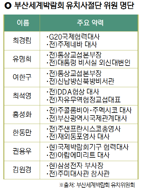 유치사절단 위원으로는 유명희·여한구 전 통상교섭본부장을 비롯해 최경림 G20 국제협력대사, 권용우 국제박람회기구(BIE) 협력대사, 최석영 전 DDA협상대사, 홍성화 전 주콜롬비아대사, 한동만 전 주샌프란시스코총영사, 김원경 삼성전자 부사장(전 주미대사관 참사관)이 참여하고 있다.