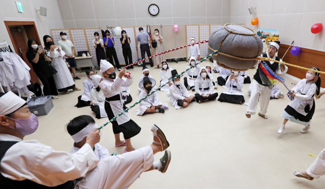 지난 5일 부산 정관박물관에서 열린 ‘무형문화재 어린이 교실’에서 어린이들이 구덕망깨소리 전수자와 함께 망깨소리 체험을 하고 있다. 망깨소리는 주춧돌을 놓을 자리의 땅을 다질 때 부르던 노동요다.
