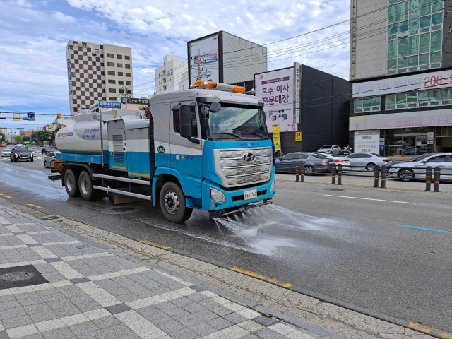 부산 사하구청 소속 살수차가 8일 당리동 한 도로에서 물을 뿌리며 무더위로 달궈진 도로 열기를 식히고 있다(위). 사하구청이 지난달 28일 감천2동 행정복지센터에서 자활근로자들에게 얼린 생수를 나눠주고 있다. 부산 사하구청 제공