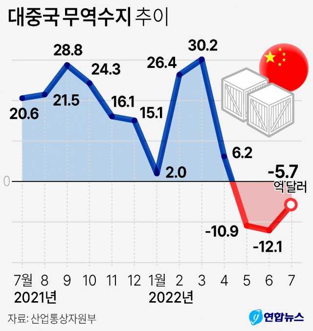 지난달 우리나라는 중국과의 무역에서 5억 7500만 달러의 적자를 기록했다. 올 5월 10억 9900만 달러, 6월 12억 1400만 달러 적자에 이어 3개월째 대중 무역수지가 적자 행보를 보인 것이다. 3개월 연속 대중 무역적자는 한·중 수교 이후 처음 있는 일이다. 이는 최근 한국 상품의 중국 수출이 감소한 결과로 분석된다. 지난달에도 대중 수출액은 132억 4000만 달러로, 지난해 7월 대비 2.5%가 줄었을 정도다.
