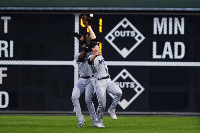 미국프로야구 메이저리그 마이애미 말린스 외야수 조이 웬들(오른쪽)과 브라이언 데 라 크루즈가 9일 열린 필라델피아 필리스와의 경기 1회 수비에서 뜬 공을 잡으려다 충돌하고 있다. AP연합뉴스