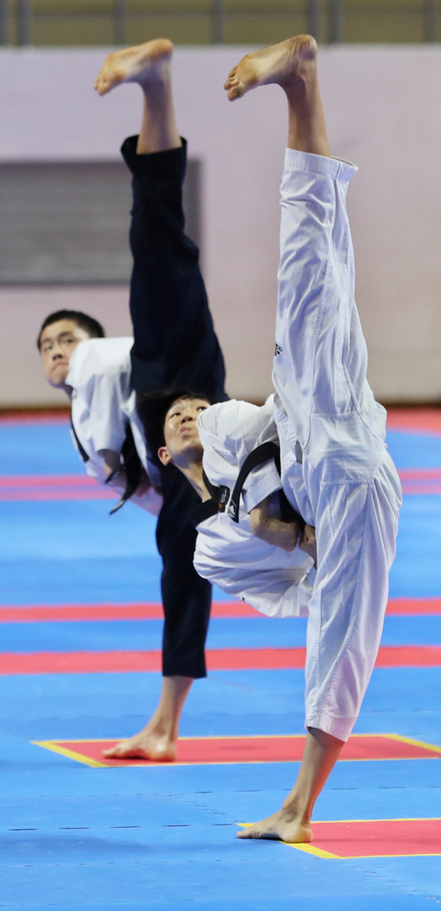 11일 부산 강서실내체육관에서 열린 제13회 고신대학교 총장배 전국태권도대회에서 참가선수들이 품새 겨루기를 하고 있다. 초·중·고, 대학부, 일반부 까지 참가해 16일까지 계속되는 이번 대회는 공인 품새와 격파로 진행된다.