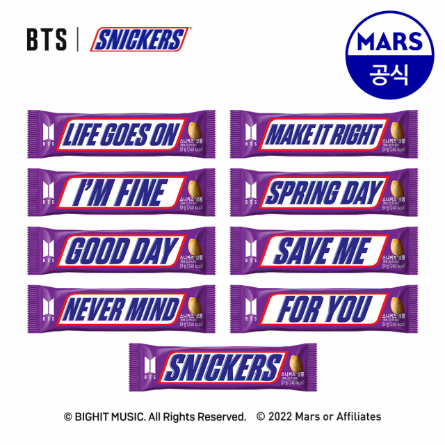 △한국마즈(유)는 초콜릿 제과 브랜드 스니커즈®와 그룹 방탄소년단이 협업한 BTS 스페셜 에디션을 한정 출시한다. 스니커즈는 1930년 출시 이후 전 세계에서 가장 사랑받는 초코바다. 피넛, 아몬드 등의 견과류와 캐러멜, 초콜릿 등이 함유돼 있어 하나만 먹어도 출출할 때 허기를 채우기에 충분한 것이 특징이다. 이번 컬래버는 스니커즈의 든든함과 코로나 팬데믹 등 예상치 못한 상황 속에서도 에너제틱한 퍼포먼스와 노래로 전 세계에 희망의 메시지를 전한 방탄소년단의 긍정적인 울림을 더해 '허기진 몸뿐 아니라 마음까지 채우며 진정한 만족을 얻을 수 있는(Real satisfaction that fills the hungry body and soul)' 콘셉트로 탄생했다. BTS 스페셜 에디션은 ‘BTS X SNICKERS=♥’라는 귀여운 문구와 함께 긍정과 희망의 메시지가 담긴 방탄소년단의 히트곡 8곡 제목을 보라색 패키지에 반영했다. 'Life Goes On', 'Never Mind', 'Save ME' 등 국내 발매곡 6곡과 'Good Day', 'FOR YOU' 등 일본어 버전 2곡의 제목을 넣은 총 여덟 개의 스페셜 에디션과 한 개의 스니커즈 에디션 총 9종으로 출시한다. 제품 구성에 따라 싱글 사이즈와 펀 사이즈 총 두 가지 버전으로 즐길 수 있다. 함께 즐길 수 있는 콘테스트도 준비했다. 9월 초부터 스니커즈 공식 인스타그램에서 특정 해시태그와 함께 스니커즈 뮤직팩을 활용한 나만의 DIY 작품의 이미지를 올리면 추첨을 통해 선물을 증정한다.