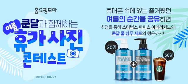 △모바일 홈쇼핑 플랫폼 홈쇼핑모아를 운영하는 '버즈니'가 '여름휴가 사진 콘테스트'를 진행한다. 오는 21일까지 진행하는 이번 이벤트는 올 여름휴가 시즌 즐거웠던 순간을 공유하는 사진 콘테스트다. 참여 방법은 홈쇼핑모아 앱에서 바다나 계곡 호캉스 등 직접 찍은 여름휴가 사진을 업로드하면 응모가 완료된다. 참여자를 대상으로 홈쇼핑모아 내부 심사를 거쳐 30명에게는 여름 휴가 태양볕에 지친 두피와 몸케어에 도움 되는 '쿤달 쿨 샴푸와 바디워시 세트', 50명에게는 '스타벅스 아이스 아메리카노'를 증정한다. 또 선정된 80개 작품 중 최우수작 5개는 홈쇼핑모아 앱 시작화면에 공개될 예정이다.