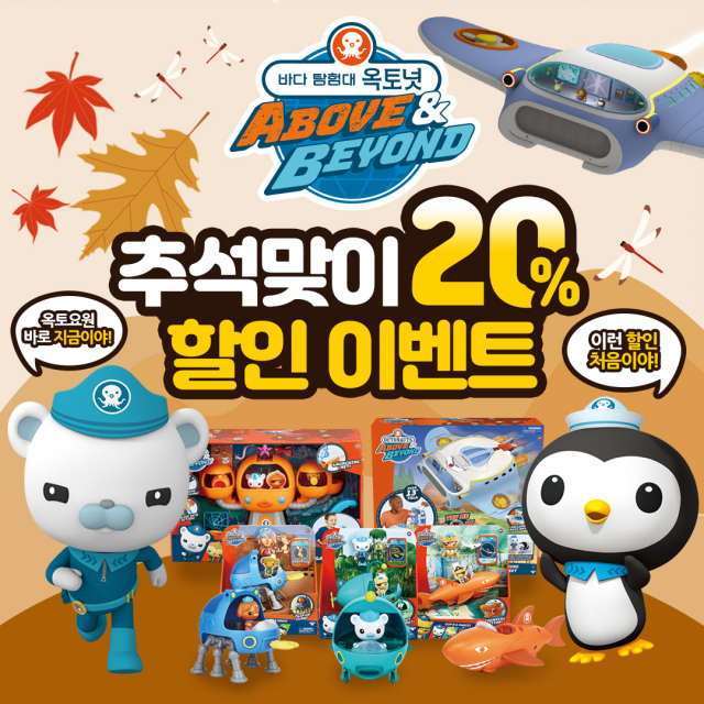△손오공은 전국 대형마트에서 '옥토넛 고객 감사 특별 할인전'을 진행한다. 옥토넛 주요 제품인 옥토레이와 옥토포드를 포함, 2022년 손오공에서 출시한 옥토넛 글로벌 공식 완구 10종을 20% 할인된 가격에 선보인다. 2022년 버전의 뉴 옥토포드, '옥토포드 슬라이딩 액션 플레이세트'는 대형 문어 형태의 해저본부로 탐험기지 놀이와 바다생물 구조활동 놀이를 함께 즐길 수 있으며 '신기방기 옥토레이 변신 본부 플레이세트'는 육해공을 누비는 옥토넛 탐험대의 메인 탐험선으로 활약 중이다. 넷플리스에서 방영 중인 육지수호 대작전에 등장하는 '테라 탐험선'이 있으며 역할놀이에 빠질 수 없는 주인공 피규어 8종으로 구성된 '옥토넛 와글와글 액션 피규어 멀티팩'도 놓칠 수 없다. 할인전은 9월 14일까지며 전국 이마트, 토이저러스, 홈플러스에서 동시 진행된다.
