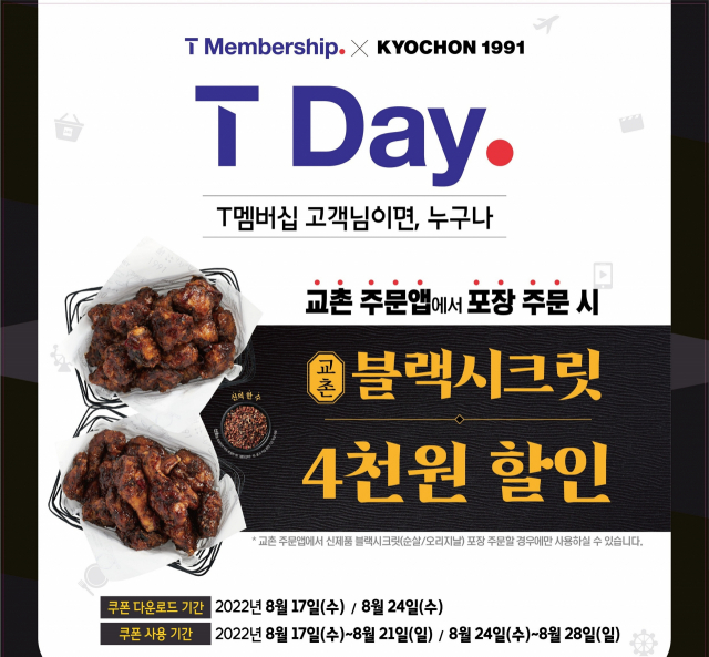 △교촌치킨이 교촌 주문앱에서 T멤버십 고객들을 대상으로 포장 주문 시 '교촌블랙시크릿'을 4000원 할인하는 이벤트를 진행한다. 신메뉴 출시 기념과 교촌 앱을 이용하는 T멤버십 고객들을 위해 마련된 것으로, 24일까지 교촌 주문앱에서 신메뉴 교촌블랙시크릿(오리지날·순살)을 포장 주문할 경우 4000원 할인받을 수 있다. 사용방법은 먼저 T멤버십 앱에서 다운 받은 4000원 할인 쿠폰을 교촌 앱에 등록한 후, 신메뉴 포장을 주문하면 사용 가능하다. 이번에 출시한 교촌블랙시크릿은 동양의 맛과 향을 교촌만의 방식으로 만든 이국적인 치킨이다. 교촌의 비법 '간장 소스'에 팔각, 계피, 회향, 정향, 산초 등 대표적인 동양의 5가지 향신료를 더해 다채로운 맛과 향을 구현했다.